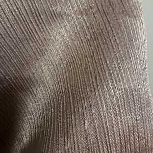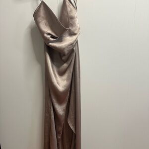 Chic tan slip dress with cowl neck. Features spaghetti straps and crisscross open back. Sleek and stylish design.