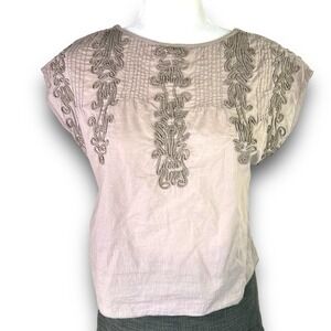 Free People embroidered boho casual top in a cropped cut with a relaxed fit. Features scrolled embroidery along the top and three snap buttons along the top of each shoulder.