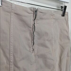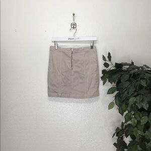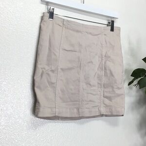 A cute tan skirt with lines running up and down, a back zipper, and no pockets. The sort has a good amount of stretch. Perfect for any season and occasion. Top latch broken off