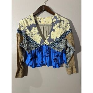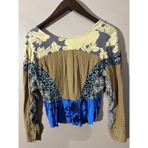 Free People Tan and Blue Ruffled Crop Blouse