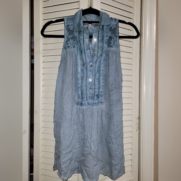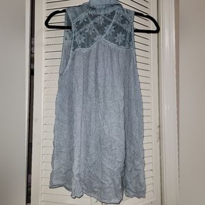 Blue Free People Tank with lace detailing at the top. Please see small stain on last photo.