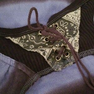 Razor back style, with a hint of country tie up flare. Pair with a jacket for colder seasons.