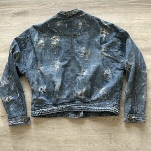 Tattered Distressed Tennis Bomber Jean Jacket Indigo