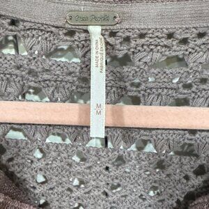 Elegant taupe sweater with intricate crochet design. Perfect for layering.