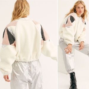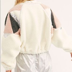 Free People Metallic Accents Sherpa Fleece Like Fluffy Plush Cropped Jacket Boxy Warm Winter Jacket Girly Feminine Ski Snow Outdoorsy Adventure Zip Jacket Outer Sherpa