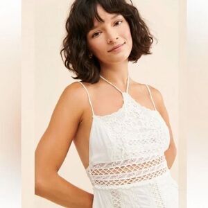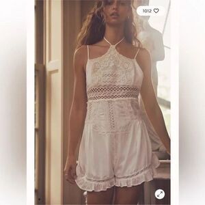 A forever romantic done-in-one, this sweet romper features crochet lace piecing throughout with ruffled shorts, tie-back halter neckline, and sultry low back design for a vintage-inspired essential.
