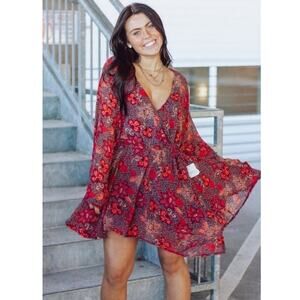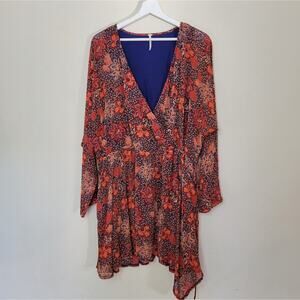 Beautiful asymmetrical faux wrap red, blue and peach floral long sleeve mini dress with adjustable waist tie.