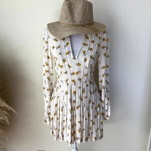 Free People by revolve Tegan Printed Dress in a cream off white with yellow floral print ft. side pockets, Pleated detail skirt, long sleeves, with boho flared slits, Back button keyhole neck closure, front keyhole detail, Side hidden zipper closure, unlined, fit and flare silhouette