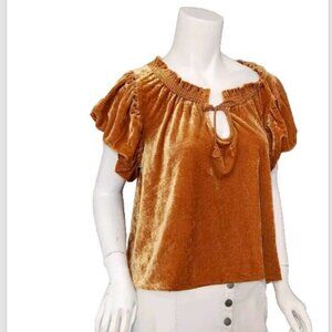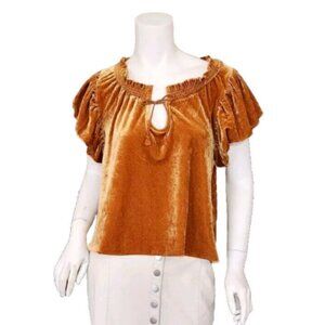 Free People Terese Velvet Top Pumpkin Pie Short Puff Sleeve Tasseled Tie Neck Keyhole Blouse Women's size Small.