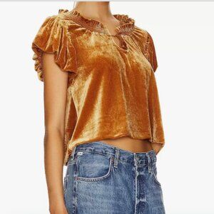Free People Terese Velvet Top Pumpkin Pie Short Puff Sleeve Tasseled Tie Neck Ke
