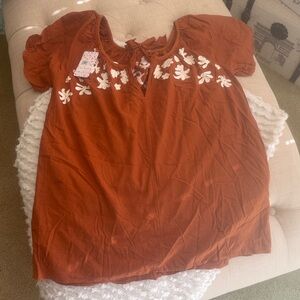 Charming terracotta dress with delicate cream floral embroidery. Features short sleeves and a round neckline. Brand new with tags! Size is small as marked, but realistically, it’s quite large in size.