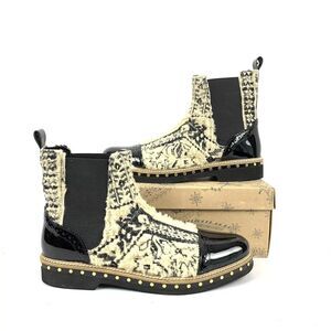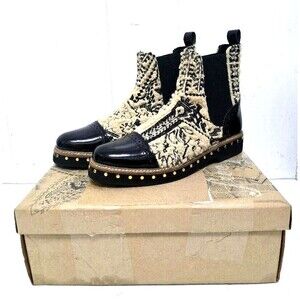 Not sold in stores or on website. Brand new in box never worn or tried on. Size 39 (9). Black leather and furry detailing. So unique and fun! Style No. 47369814; Color Code: Make a statement in these so cool Chelsea boots featuring a textile design with a patent leather toe and heel. Studded sole Pull-on style Elastic side accents Fit Note: This style runs true to size, if in between sizes; we suggest sizing up. FP Collection Artisan crafted from fine leathers and premium materials, FP Collection shoes, bags and belts are coveted for their signature vintage aesthetic. Import Measurements for size 39 Shaft: 6 in Platform: 1.5 in