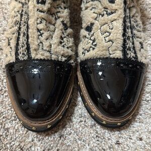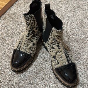 Make a statement in these so cool Chelsea boots featuring a textile design with a patent leather toe and heel.