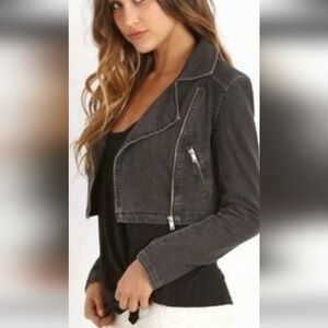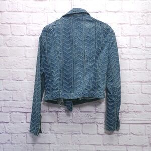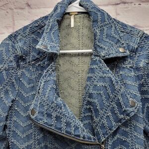 Free People Textured Chevron Blue Denim Jacket Womens 8 Asymmetrical Zip Moto