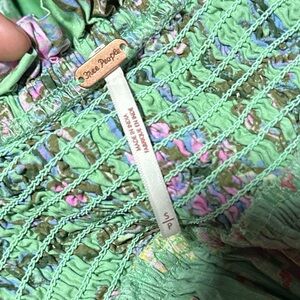 Vibrant green skirt by Free People. Features textured design with floral accents in pink and purple.