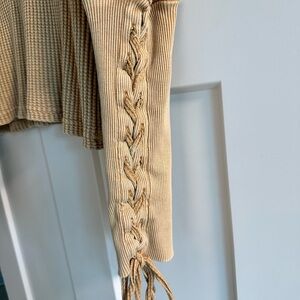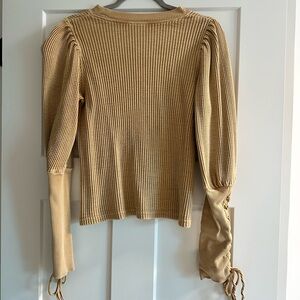 Elevate your wardrobe with this stylish tan long sleeve top with the details up the arm.