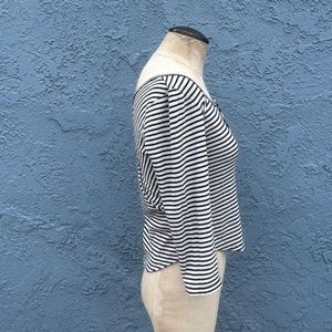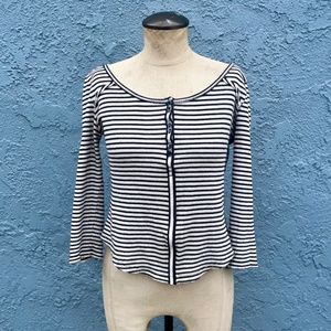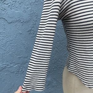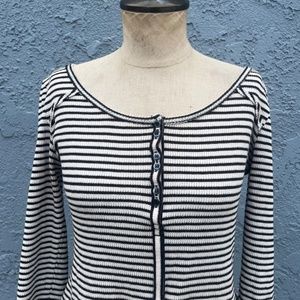 A cozy cropped thermal that features a scooped neckline, a six-button henley placket, and playful racerback seaming. Black and white striped colorway. In great shape with minimal signs of age