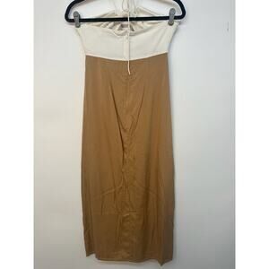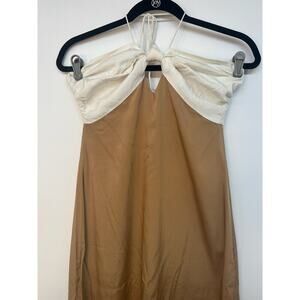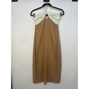 Brown crepe (96% Viscose, 4% Spandex). Sheath. Halter neckline. Sleeveless. Back zipper closure. 41.5" from shoulder to hemline. Imported.