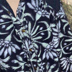 Features: Soft printed fabrication with a sherpa-inspired lining, folded collar neckline, button-up closure, pockets for hands, elasticated hemlines