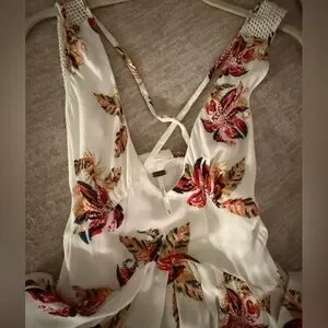 breezy, floral-print sleeveless dress featuring a daring plunging neckline.