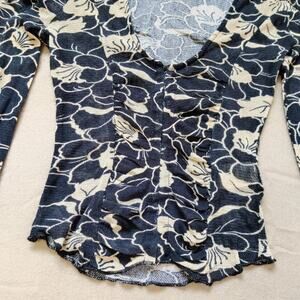 Free People Through the Meadow Floral Top Black Tan Sz XS Ruched Mesh Y2K Bell Sleeve