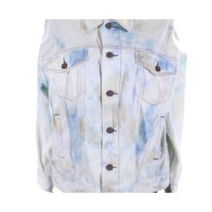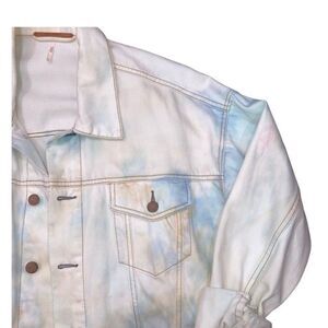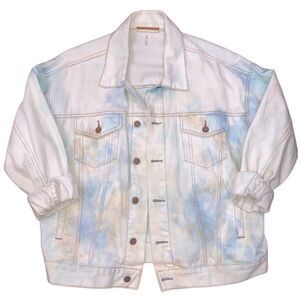 Free People trucker denim jacket in light-wash tie-dye. Slouchy cozy look. Size x-small, fits more like a medium / large. MSRP retail $148.