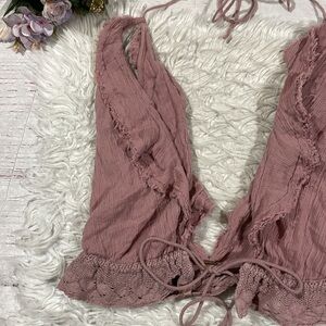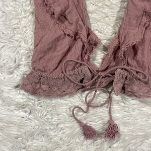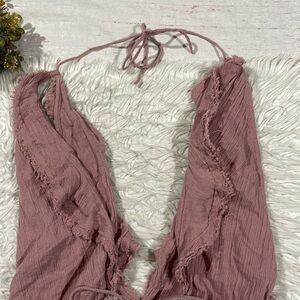 Free People blush muted pink colored tie front tassel crop top. This top is in great used condition