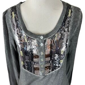 Free People Tiger Eyes Sequined Henley Tee in Washed Black Size Small