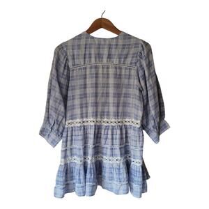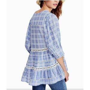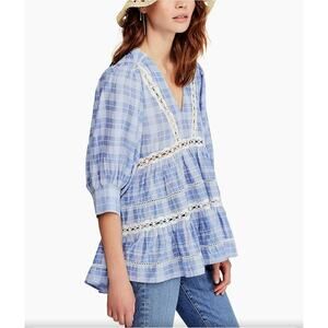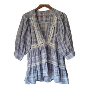 Free People Time Out Plaid Lace BOHO Tunic Top Blue White Women's Size Small