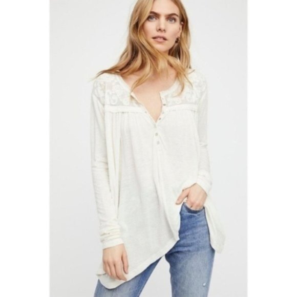 Ultra soft long sleeve tee featuring crochet details and a half button front design.