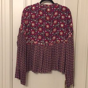 Free People embellished long sleeve outer layer top. Drop shoulder sleeves. Sleeves have cuffed hem with unfinished edges at top. Ties in front at top and bottom of yolk.