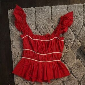 Stylish red ruffled top perfect for any occasion. Add a pop of color to your wardrobe with this vibrant piece.