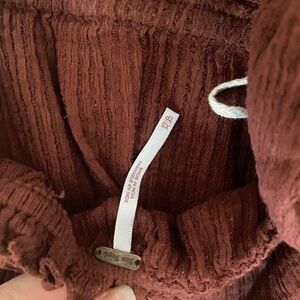 Purchased this but never ended up wearing it. The XS was just a bit small on me. Super cute top - strapless with a tie in the back in a pretty brown cinnamon color. Depending on what you wear on the bottoms it could be more of a crop top fit, but with a higher waisted pant or shirt it’ll fall right at the waste of the pant.