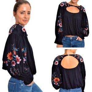 Free People Top Black Floral Embroidered Cut Outs. Oversized. Stretchy Linen Cotton Blend. Elasticized Bubble Hem. Back Button. Balloon Sleeves. Embroidered Flowers Both Front & Back. Machine Wash. Tagged Size S. May also fit a M Medium. Bust: 20"x2 flat across underarms without stretching Waist: 25"x2 Length: 22" Condition: Preowned. Greatt Condition. NO stains. NO fraying. Metal tag portion of brand tag removed. Hbin 14.2oz geminitiger7anth dep. Boho Gypsy Peasant Johnny Sundance Embellished Farmhouse Grunge . FAST SHIPPER ** ships UPSP Priority same or next business day. **Pricing Preowned depends on STYLE, Fabric Content, Condition, Vintage Age, Scarcity & Brand. Items are priced to Sell. Offers are rarely sent.