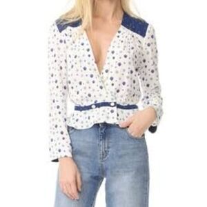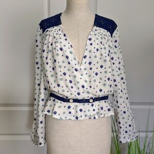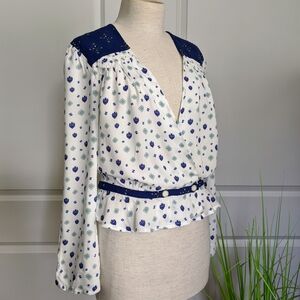 Free People Top Half Wrap V-Neck Long Sleeve Cinched Waist Ivory Blue M NWT