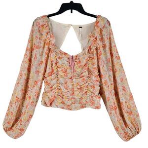 This Free People blouse top in size M features a floral print in orange, yellow, and white colors on a chiffon fabric. The square neckline and balloon sleeves give it a bohemian and hippie vibe, perfect for travel, parties, or casual wear in summer or spring. The flowy and lightweight design makes it a colorful and stylish choice for women.