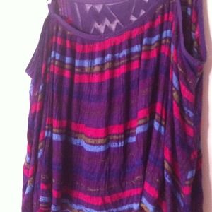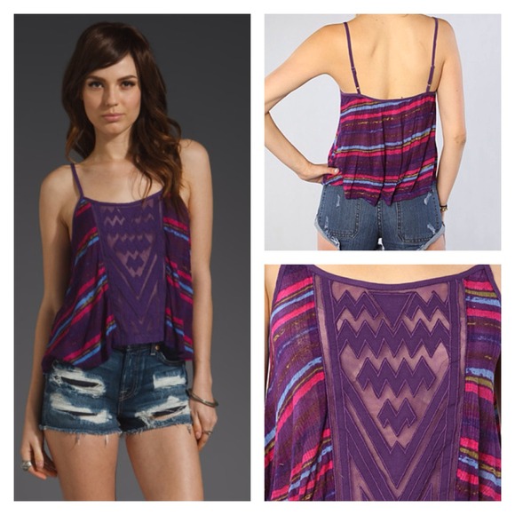 Free People purple Aztec embroidered front sleeveless swing tank. Adjustable shoulder straps, and embroidered zig-zag pattern on front side. Approx. 13.5" long, oversized loose fit. 100% Rayon, hand wash cold. Like new condition, never worn.