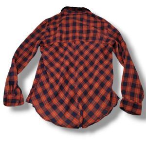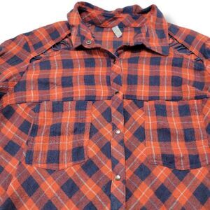 Free People Top Size Small SM Long Sleeve Button Down Shirt Plaid Open Shoulders Women's Shirt Free People Shirt Casual Shirt Orange Blue Gray Plaid