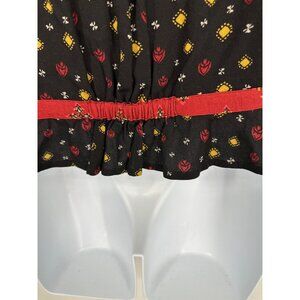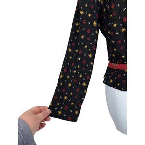 This blouse combines vintage-inspired floral patterns with modern wrap-style design. Its red embellished shoulder and belted waist offer a tailored and elegant look.