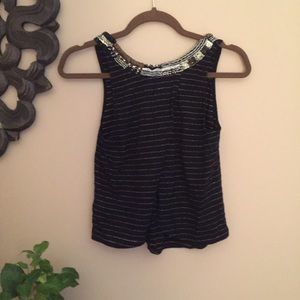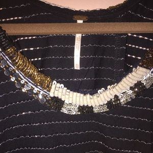 Black top with metallic stripes throughout and statement beading at neckline. Slightly worn but perfect condition.