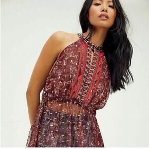 Free People Top Women's Size Med Red Ria Sleeveless Sheer Embroidered Boho Maxi