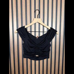 Free People Top XS Black Cut Out Back Rouched Front Cropped Shirt Jersey Knit