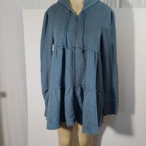 Free People Tiered Trapeze Zip Sweatshirt with attached hood. Zipper opening in front. Two hip pockets. Drawstring pulls at front of neckline.