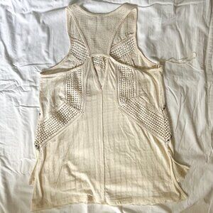 2010s Free People tank top with crochet and metal embellishments. Small, almost unnoticeable hole in the front of the fabric, but otherwise in perfect condition.