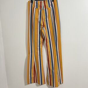 Slit front flare pants with yellow and red stripes, making them perfect for a festival or 70s-inspired outfit. Made from a comfortable cotton and elastane blend, these pants have a high rise and a flared leg style, ideal for a bohemian or hippie look.