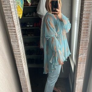 XS-M. Fabric is an accordion mesh. There is a liner through the body (arms still sheer) but would still require nude undergarments. High low hem. Work once. Smoke free home.