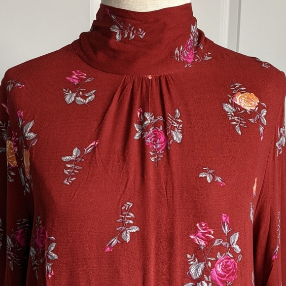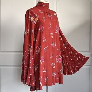 Free People Tunic Dress Mock Neck Long Bell Sleeve Open Back Floral Red M NWT