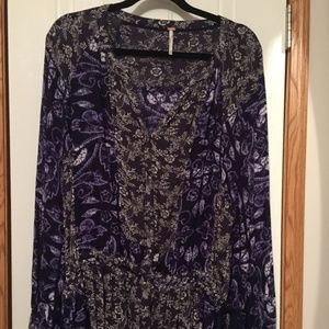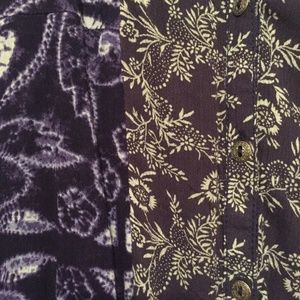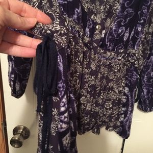 Has two adjustable ties on each side. Buttons down the front and has buttons on the sleeves.