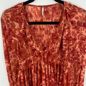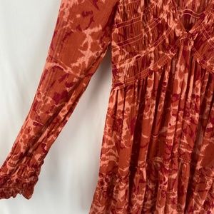 Free People Tunic Top Blouse Top Size Small Orange Print V-Neck Long Sleeves