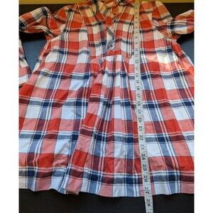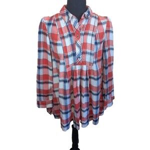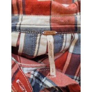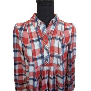 This Free People tunic top is a stylish piece with a boho western theme, featuring a relaxed fit and pleated details. The long sleeve top has a collared neckline and button closure, making it perfect for various occasions including travel, parties, casual outings, and workwear. The top is made of a blend of polyester and cotton, ensuring both comfort and breathability. With a red plaid pattern, this tunic top is a versatile addition to any wardrobe, suitable for all seasons.